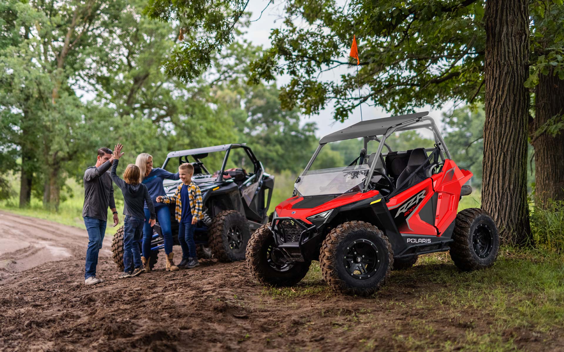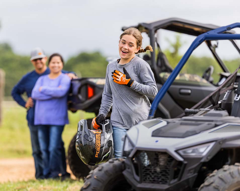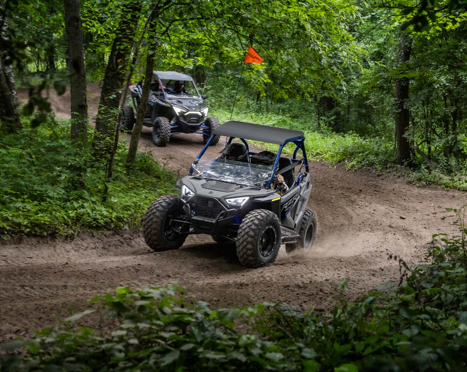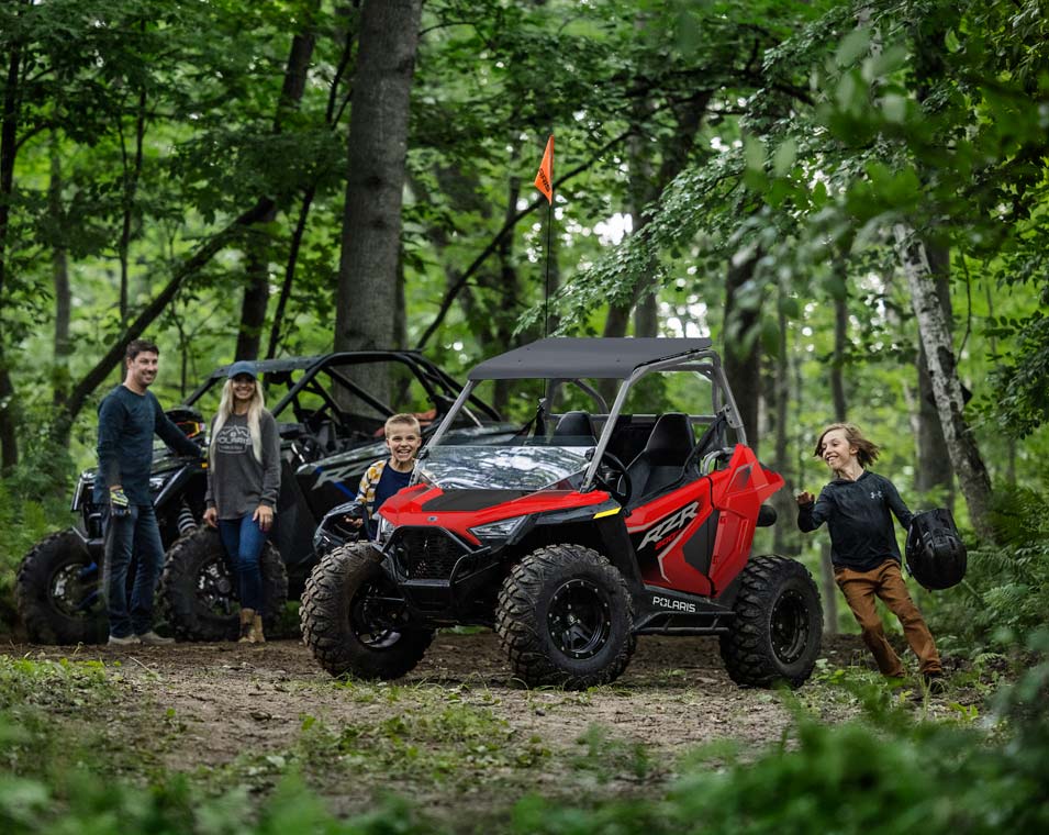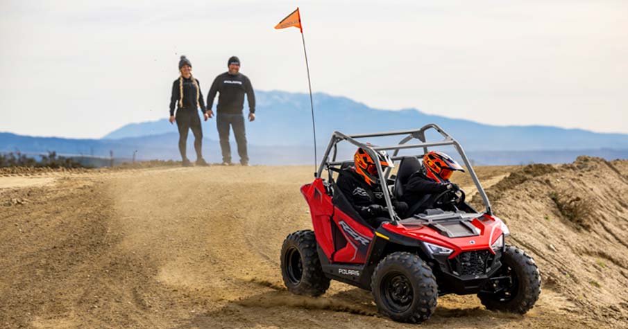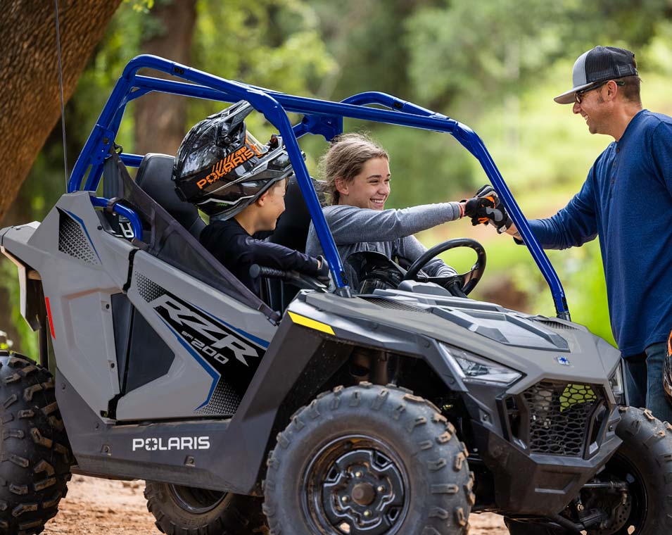 Le RZR 200 accompagne vos enfants de 10 à 16 ans tout au long de leur progression grâce au moteur EFI de 180 cm3, au siège et volant réglables, le siège passager et les accessoires en option.